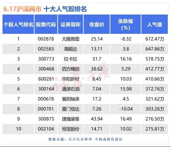 6月17日,沪深两市双双下挫,成交量变化不大。板块方面油气开采、电池涨幅居前,游戏、生物制品板块跌幅居前。人气股方面华阳新材、恒宝股份收于涨停,厦门信达、元隆雅图跌幅居前。下面是今日十大人气股排名的详细情况。